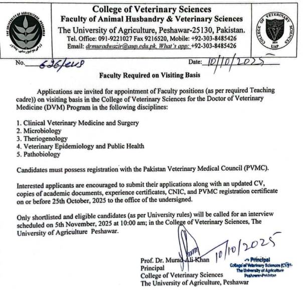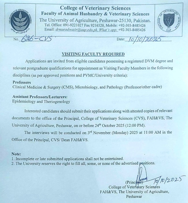 Visiting Faculty required at CVS for DVM Program, UAP.